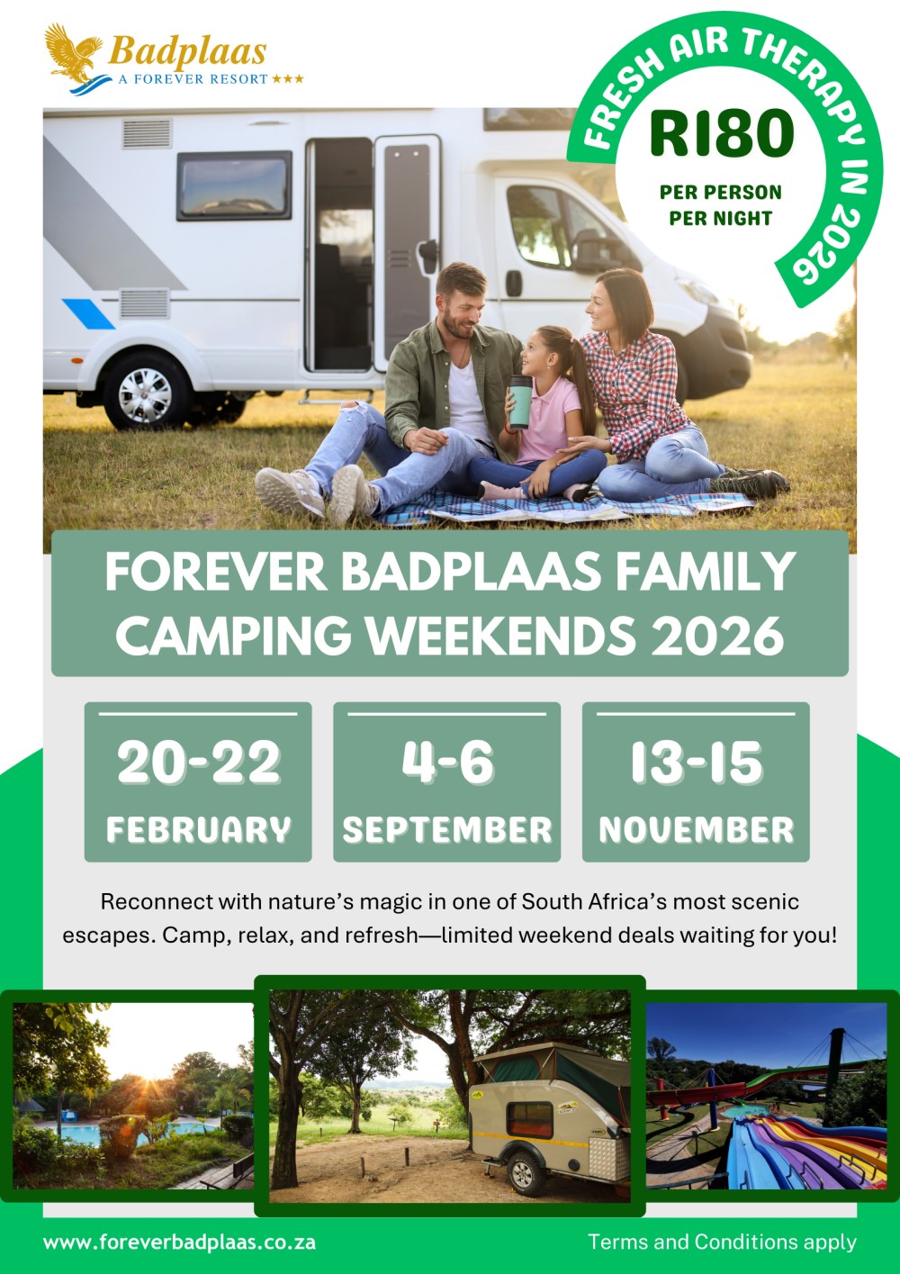 Book your Camping stay and pay only R500 per night for 4 people for the weekend of 18-20 September 2026. Book now!