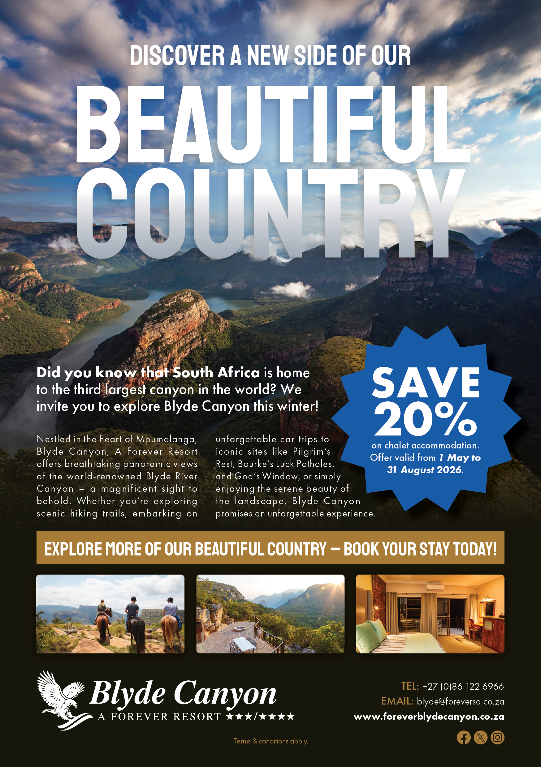 Did you know that South Africa is home to the third largest canyon in the world? We invite you to explore Blyde Canyon this winter and save 20% on Chalet Accommodation. Book today!